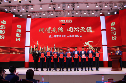 為增強梯隊建設(shè)人才培養(yǎng),搭建更好的員工發(fā)展平臺,2019年卓遠(yuǎn)股份重點開展和實施潛力骨干培養(yǎng)計劃,內(nèi)部推選30多位專業(yè)過硬、技能熟練、業(yè)績突出的人才加入潛力骨干培養(yǎng)計劃。通過系統(tǒng)的培訓(xùn)和導(dǎo)師的幫扶帶,最終工作能力突出、管理能力提升的個人得到晉升機會。大會上,李總正式為9名獲得晉升的卓遠(yuǎn)骨干頒發(fā)人事任命書。
