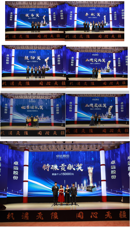 公司一直注重人才的培養(yǎng)和獎勵,將“員工是企業(yè)發(fā)展的動力和源泉”作為公司人才理念。晚會重要時刻,隆重啟動2019年度頒獎盛典,優(yōu)秀員工獎、優(yōu)秀團(tuán)隊獎、鼓勵獎、奉獻(xiàn)獎、服務(wù)獎、保障獎、業(yè)績突出獎、業(yè)績最佳獎、特殊貢獻(xiàn)獎共計9項大獎相繼頒發(fā),33位個人和2個團(tuán)隊分別獲得表彰,公司相關(guān)領(lǐng)導(dǎo)為獲獎人員頒發(fā)了榮譽獎杯和獎牌。沉甸甸的獎項,是卓遠(yuǎn)賦予先進(jìn)個人和團(tuán)體的榮譽,也樹立了其他全體卓遠(yuǎn)人的學(xué)習(xí)榜樣。